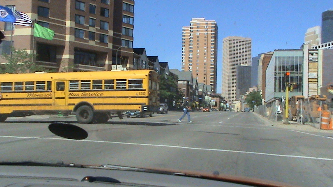 Minneapolisin keskustaa. Amerikassa koululaiset kuljetetaan keltaisiksi maalatuilla busseilla kouluun. Kun bussi pysähtyy kadulla, se kytkee hätävilkut päälle ja sitä ei saa ohittaa.