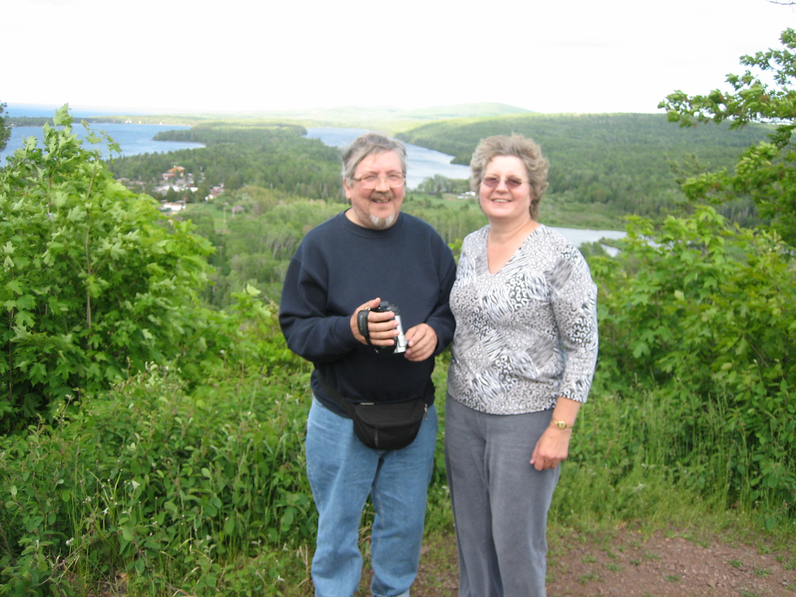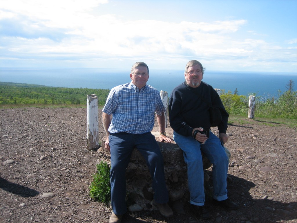 Liisan mies Dennis Kytola ja minä niemen korkeimmalla kääntöpaikalla. Taustalla näkyisi Kanada, ellei ilmassa olisi vesihöyryä. Dennis oli ollut kaivoksen konekorjaamolla töissä koko uransa ja jäänyt eläkkeelle polvinivelien takia. Wattonista Marquetteen oli maassa niin paljon rautaa, että auton kompassi sekosi.
