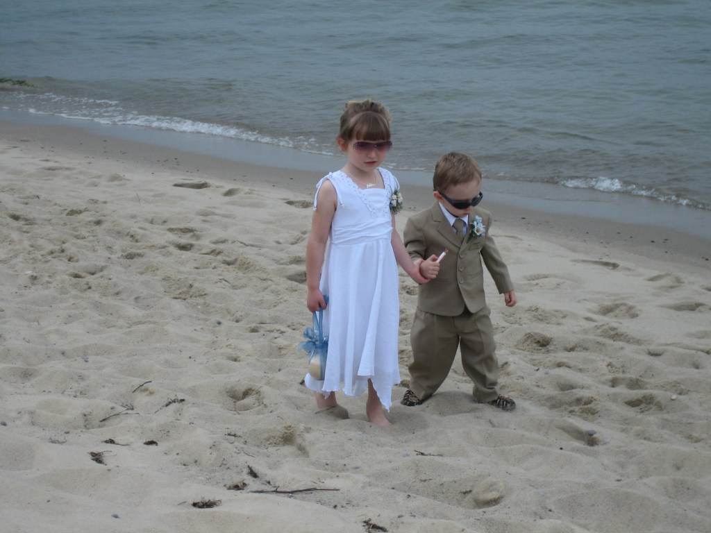 Morsiustyttö ja morsiuspoika rannalla. Amerikassa nähdään vaivaa seremonian vuoksi.