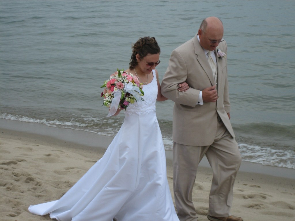 Kävimme Dennisin serkun tyttären häissä Lake Superiorin rannalla. Isä taluttaa tytärtään vihkiseremoniaan.