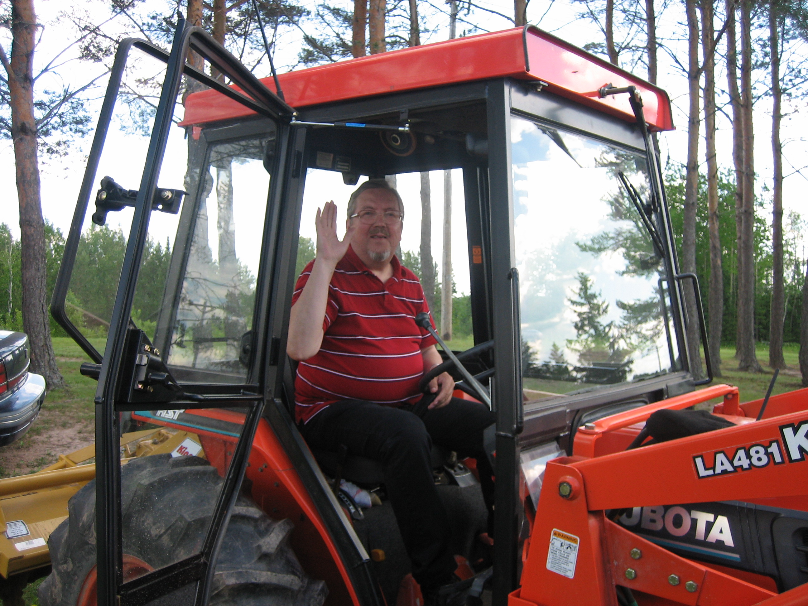 Sain ajaa Dennisin Kubota traktoria. Tontti oli noin 5 ha, ja oli puutarha ja kasvimaa, joissa traktorilla oli töitä. Pihassa talon ja tien M28 välissä oli vanhoja puita. Dennis harvensi metsää ja teki polttopuita. Eräs urakoitsija ajoi laitteillaan ohi ja kävi jyrsimässä kannot.