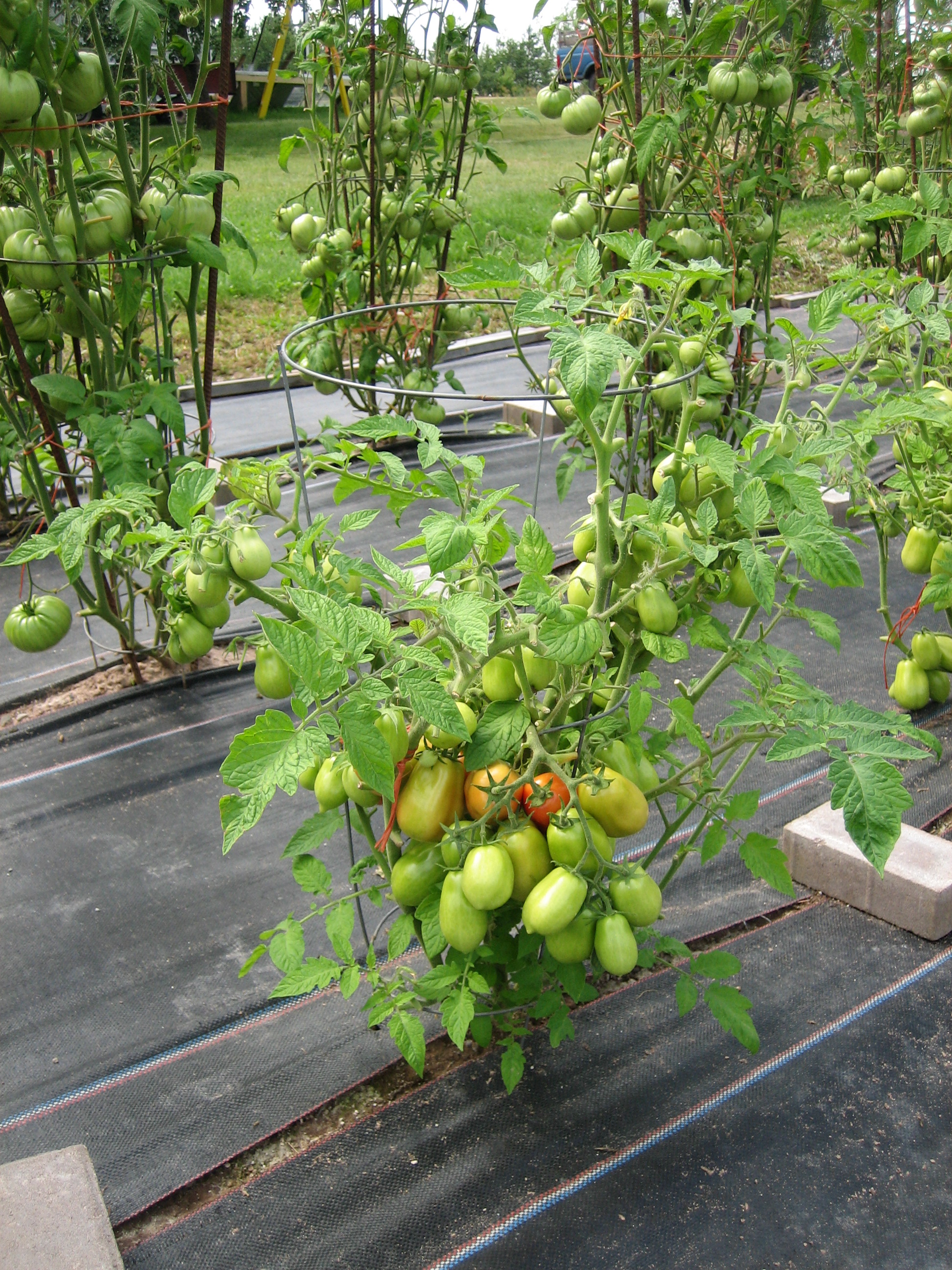 Liisan tomaatteja heinäkuussa. Niistä riittää myös myyntiin. Tomaattien väliin oli vedetty lumiaidassa käytettyä kangasta, etteivät rikkaruohot kasva. Liisalla oli ollut keväällä paljon taimia, ja hän möi niitä vieraille dollarin kappale. Marketissa taimet maksoivat 6,99 dollaria kappale ja olivat paljon pienempiä.