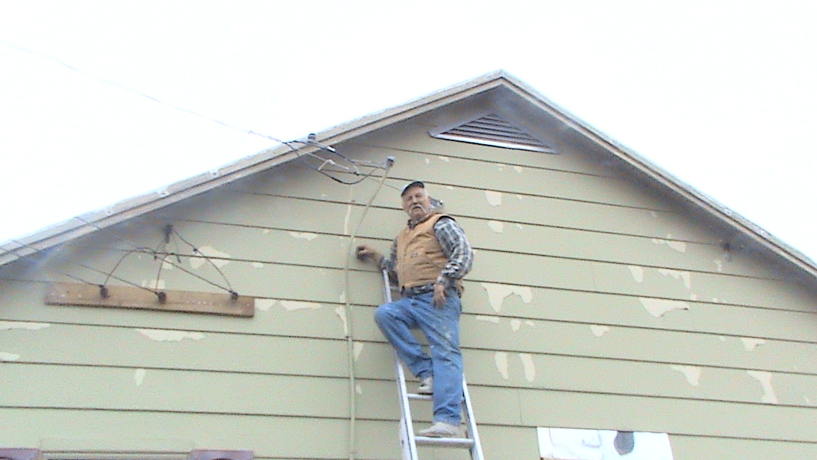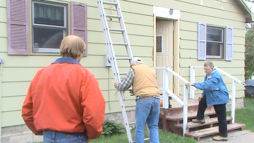 Urpo Vartainen talon sähköjohtojen kimpussa. Hän siirsi sähköt seinälle, koska katto täytyi uusia ja räystäällä johdot olivat tiellä. Urpo on tehnyt muuraustöitä ihmisille Chicagon lähellä. Pojan talo on Pohjois-Michiganissa Wattonin kaupungissa Korpi Roadin varrella. Alueella on paljon suomalaisvaikutteita. Alueen tiet ovat suorassa kulmassa, koska ne on tehty neitseelliseen metsään.