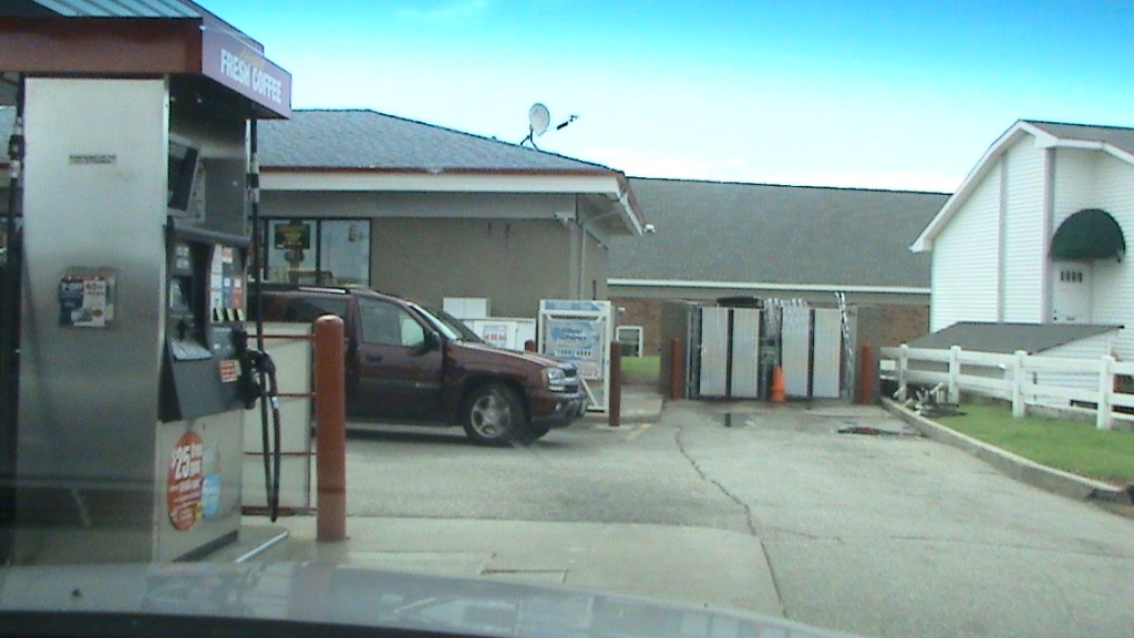 Bensa-asema oli eri näköinen kuin meillä. Amerikassa ei prameilla rakenteilla. Bensaa on vain automaateissa. Pitää olla luottokortti, että saa tankattua.