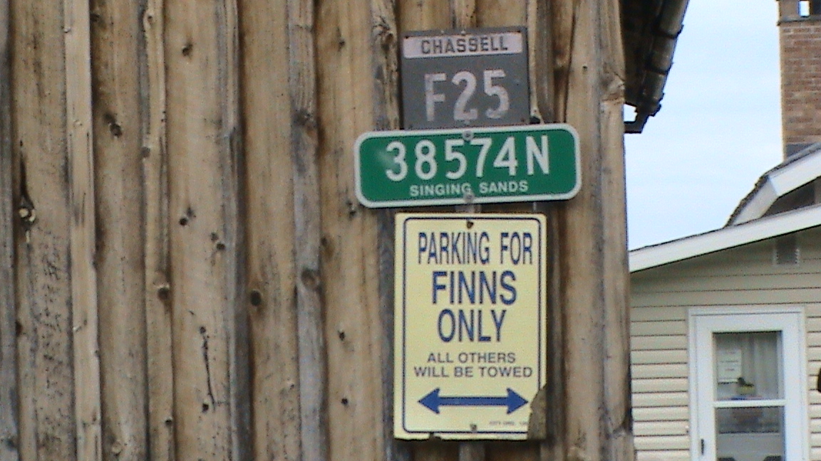Vanhan suomalaissukuisen miehen vitsi. Parkkeeraus vain suomalaisille, muut hinataan pois.