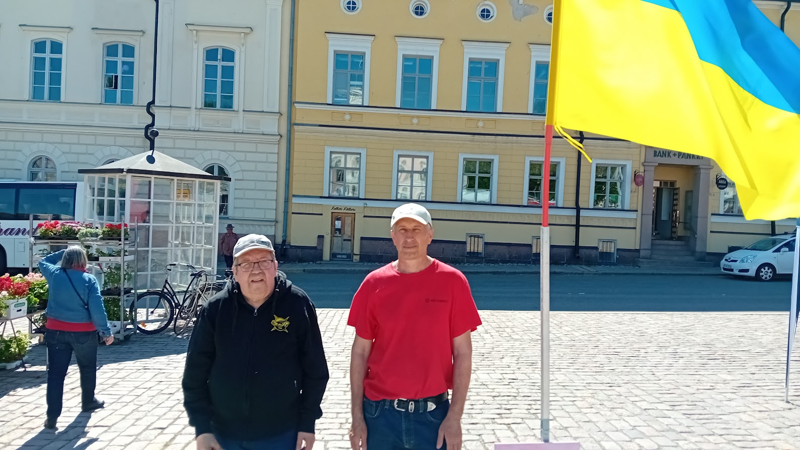 Ukrainan Mariupolista kotoisin oleva Pjotr ja minä torilla. Kaksi ukrainalaista piti pöytää koko kesän torilla. Kävin juttelemassa vähäisen venäjäni, ja Pjotrin vähäisen englannin avulla. Pjotr luki koko kesän ahkerasti englantia ja edistyi siinä hyvin. Emme puhuneet paljoakaan sodasta, koska olimme yhtä mieltä hyökkääjän rikollisuudesta. Sota on kauhea asia, ja Ukrainan sota pitäisi saada loppumaan reiluun ratkaisuun. Haave 2014 vuoden alun rajoiksi on ehkä kuitenkin liian toiveikas. Yleensä sota päättyy kompromissiin jossa häviäjä menettää maata ja rahaa. Itsepäisen hyökkääjän vuoksi sota pitkittyy. Toivottavasti lännen apu jatkuu. Pjotr lopetti torilla käymisen syyskuun lopulla.