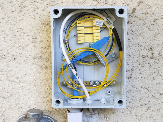 Liitos rasiassa. Valokuitu päätetään tyypillisesti omakotitalon ulkoseinään. Se liitetään ulkoseinään asennettavassa rasiassa toiseen, seinän läpi vietävään valokuitukaapeliin, joka kulkee sisätiloissa valokuitupäätteelle saakka. Koska valokuidun katkaisu on työlästä, jätetään kaapeleihin yleensä reilusti varmuusvaraa, joka näkyy ylimääräisinä ohuina kaapelikieppeinä asennusrasioiden sisällä. ALEKSI VÄHIMAA