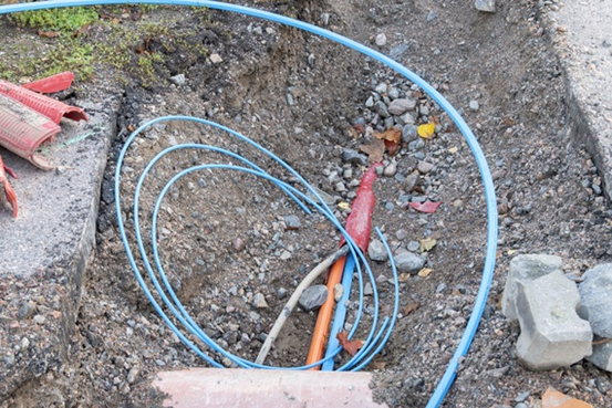 Suojattu hius. Vaikka itse valokuitu vastaa paksuudeltaan suurin piirtein ihmisten hiusta, se on pakattu lukuisiin suojakerroksiin. Kuvassa näkyy oranssi paineilmaputki. Sitä huomattavasti ohuempi kuitukaapeli asennetaan paikoilleen paineilmalla puhaltamalla. Puhallusetäisyys voi olla parhaimmillaan satoja metrejä. ALEKSI VÄHIMAA