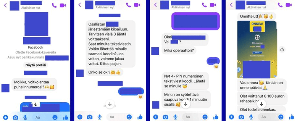 – Hei (nimi), olemme voittaneet kilpailussa, lähetä minulle 6-numeroinen koodi, huijari saattaa poliisin mukaan aloittaa keskustelun.