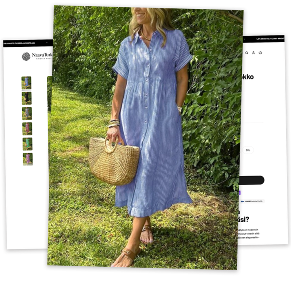 Reeta-mekko, johon Outi ihastui, ei myöskään ole NaavaTurun omaa tuotantoa. Se käy ilmi, kun etsii kuvan alkuperää Googlen käänteisellä kuvahaulla. Sama mekko löytyy yli 50 verkkokaupasta eri nimillä: Mara, Melania, Elovis, Helmi, Noora ja Amary.