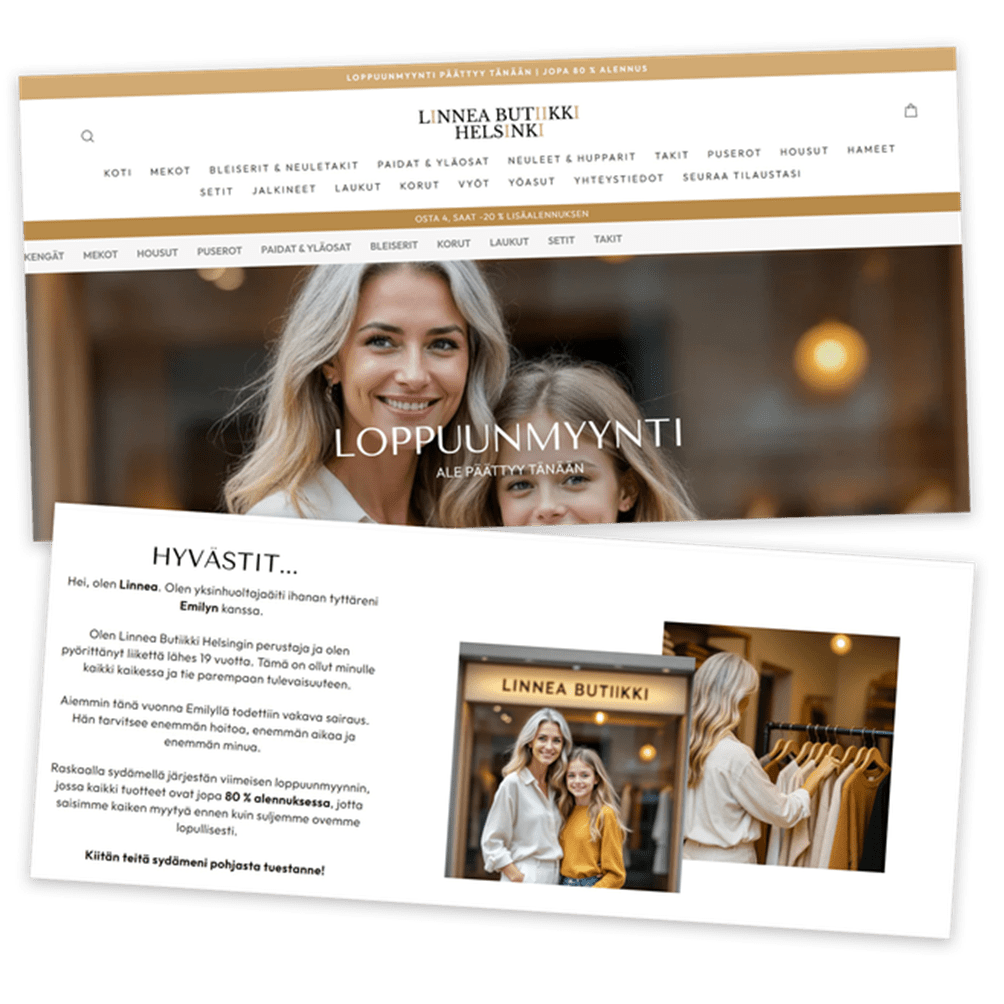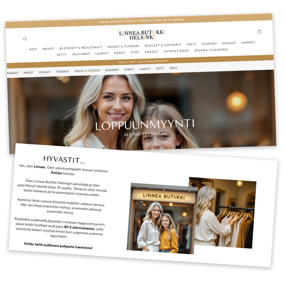 Juuri nyt Linneassa on kuulemma meneillään loppuunmyynti. Tarina on koskettava (sekin tyypillinen merkki huijausyrityksestä). Kauppias kertoo, että butiikki on hänelle kaikki kaikessa, mutta loppuunmyynnin taustalla on tyttären sairaus.