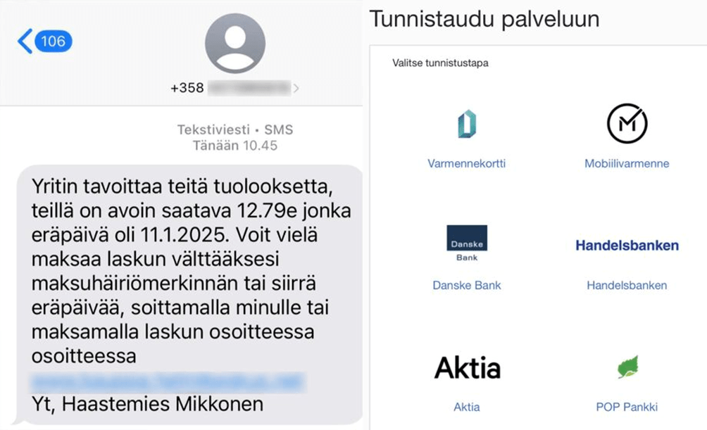 Tältä näyttää ”haastemies Mikkosen” nimissä lähetetty huijausviesti sekä pankkitunnuksia kalasteleva nettisivu. Kuvakaappaus