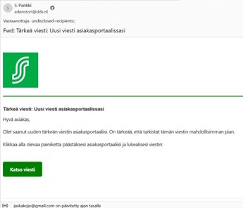 Tuli outo sähköposti, jossa kerrotaan tärkeästä viestistä asiakasportaaliin ja kehotetaan katsomaan viesti. Lähettäjän sähköpostiosoite viittaa Hollantiin. En kokeillut katsoa viestiä linkin kautta. Siellä olisi kysytty kuitenkin pankkitunnuksia ja tyhjennetty tili.